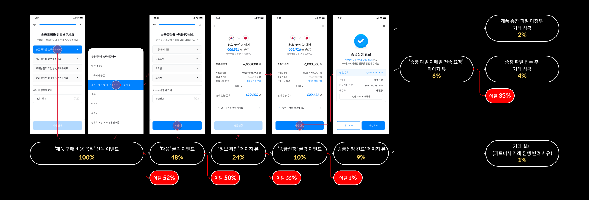 In the JPY remittance application process, the 'Please select the purpose of remittance' step has an attrition rate of approximately 52%. When 'purchase of goods' is selected as the remittance purpose, users are required to attach the invoice issued for the goods without prior notice.