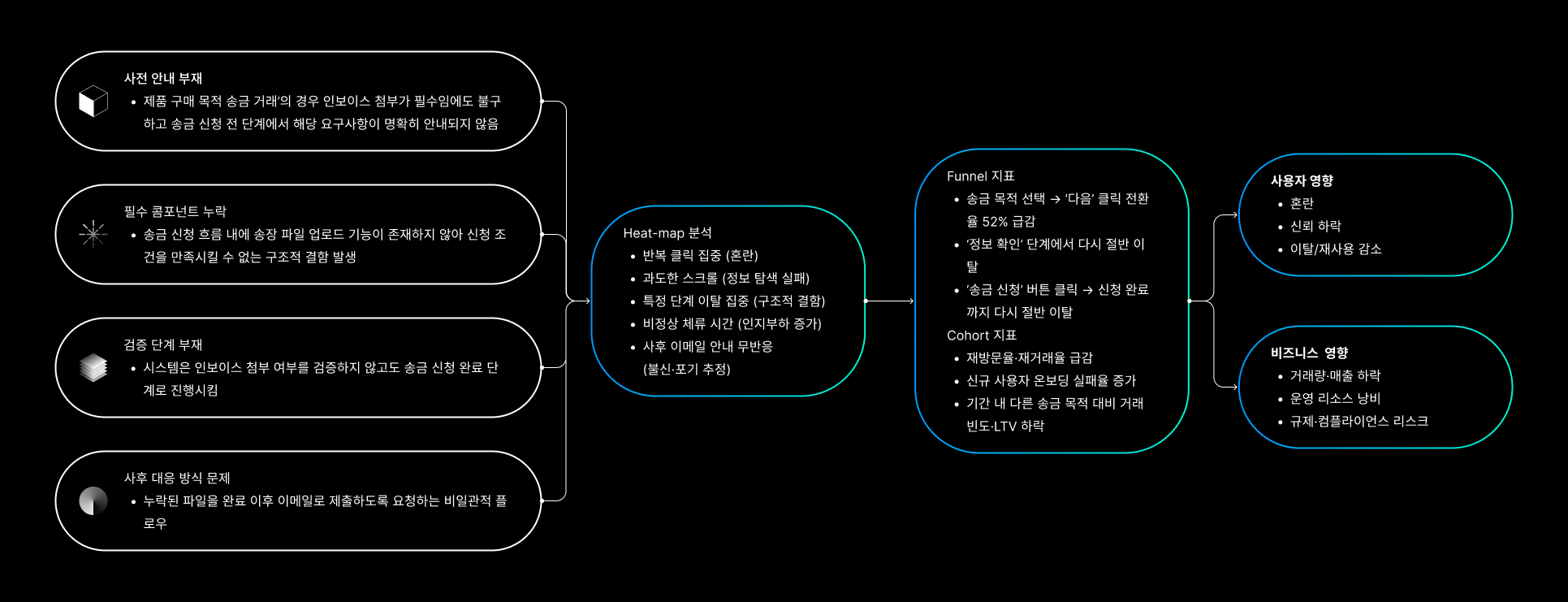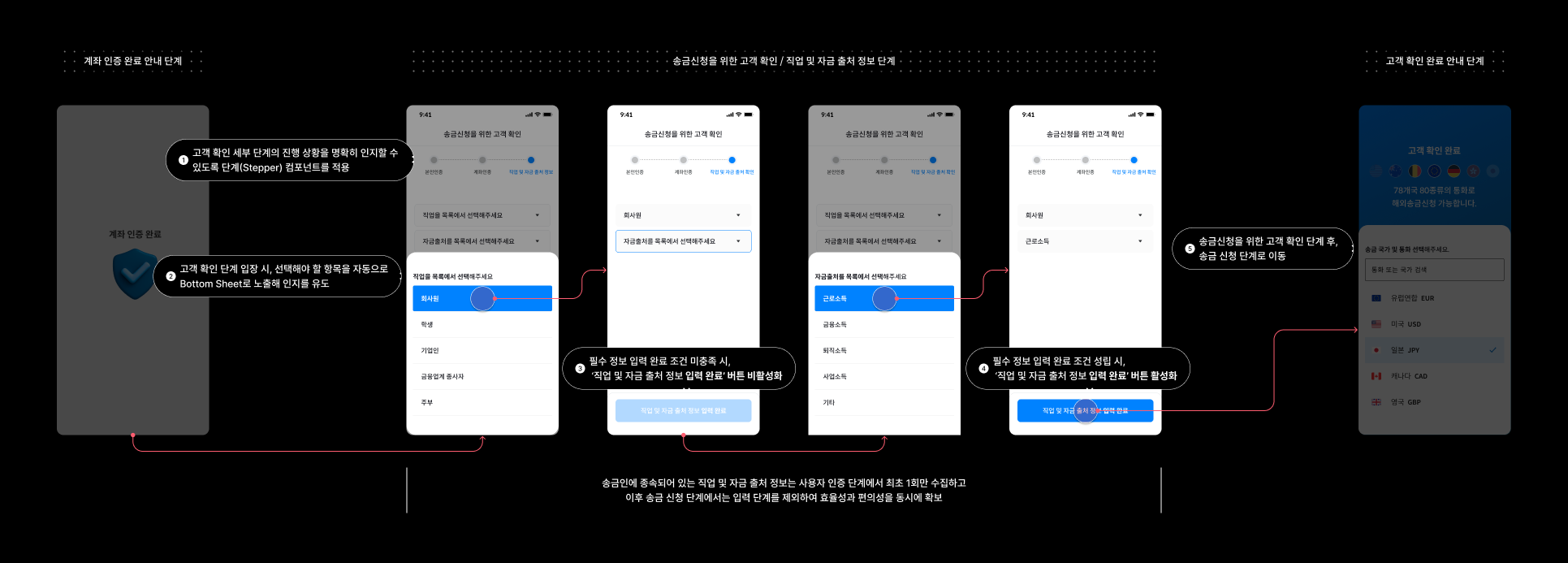 We identified a 52% attrition rate at a key step in our remittance process and hypothesized that this was due to a confusing, non-linear flow. To solve this, we restructured the application into two distinct stages: a Customer Verification (KYC) flow for fixed, sensitive information and a Remittance Application flow for variable, transaction-specific details.