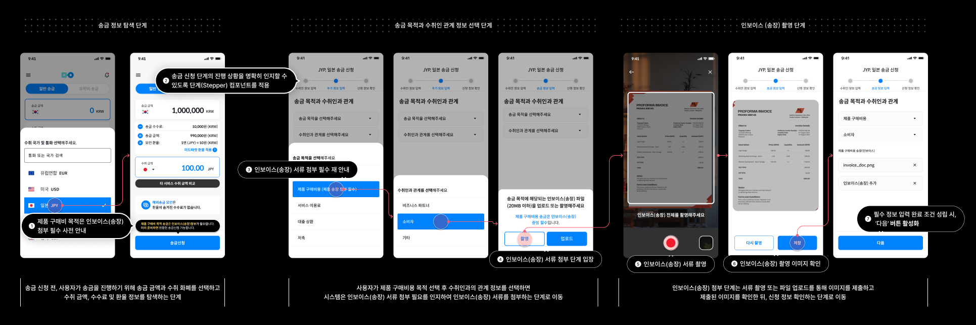 To reduce user drop-off rates during JPY product purchase remittances, I redesigned the flow to provide clear predictability. The system now notifies users of the mandatory invoice requirement upfront and guides them seamlessly through a dedicated capture/upload process without leaving the app.
